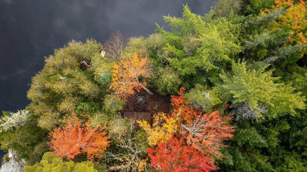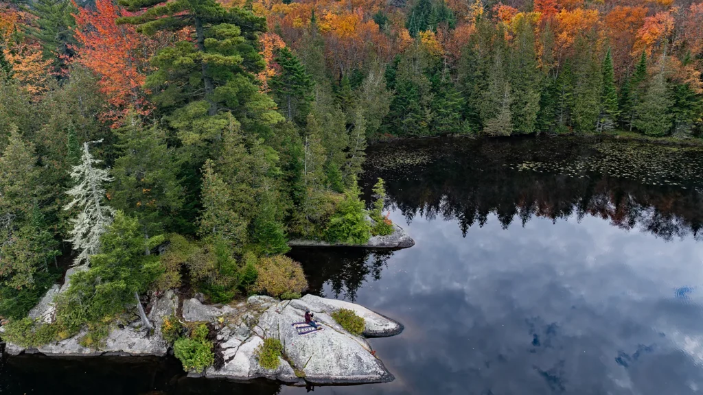 The human presence is minimal: lean-tos weathered by seasons, fire pits blackened with age, picnic tables mossing over. Simple journal entries record nights pressed against thin canvas tents. Boots wet in the morning light. Campfires scent the air. Sit quietly, listen to the loons, watch the leaves drift. Silence feels earned.