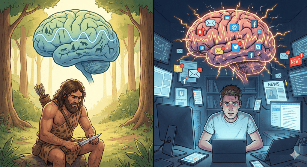 Your nervous system does not know the difference between a real threat and digital pressure. It reacts the same way to a deadline as it once did to danger.
