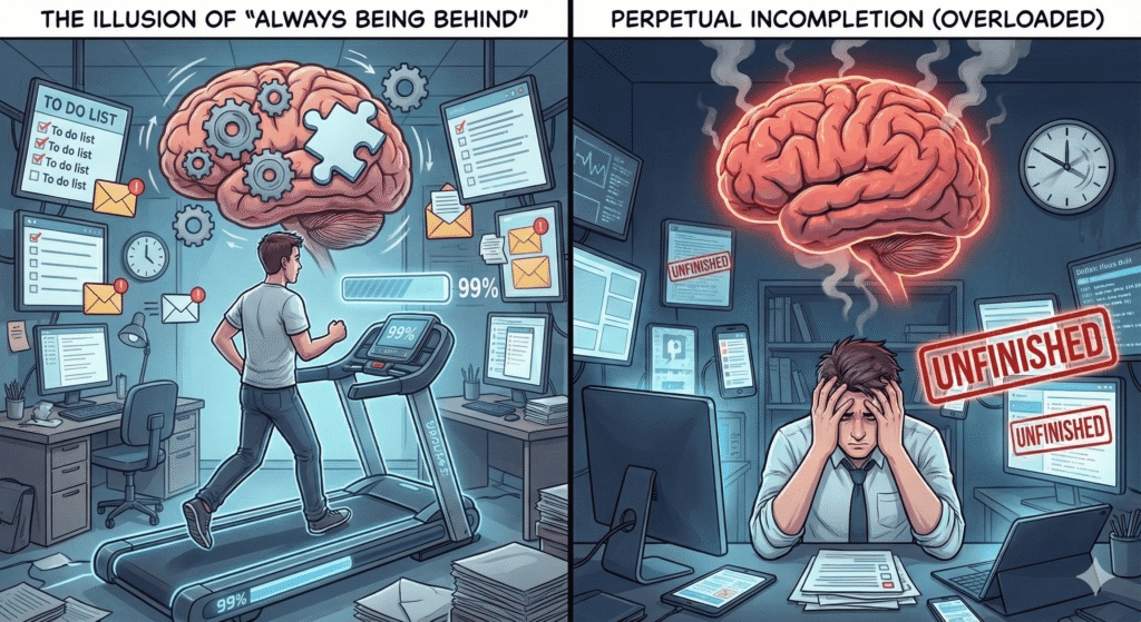 A psychologist calls this perpetual incompletion. The brain rarely gets a sense of closure. Without closure, stress becomes chronic.