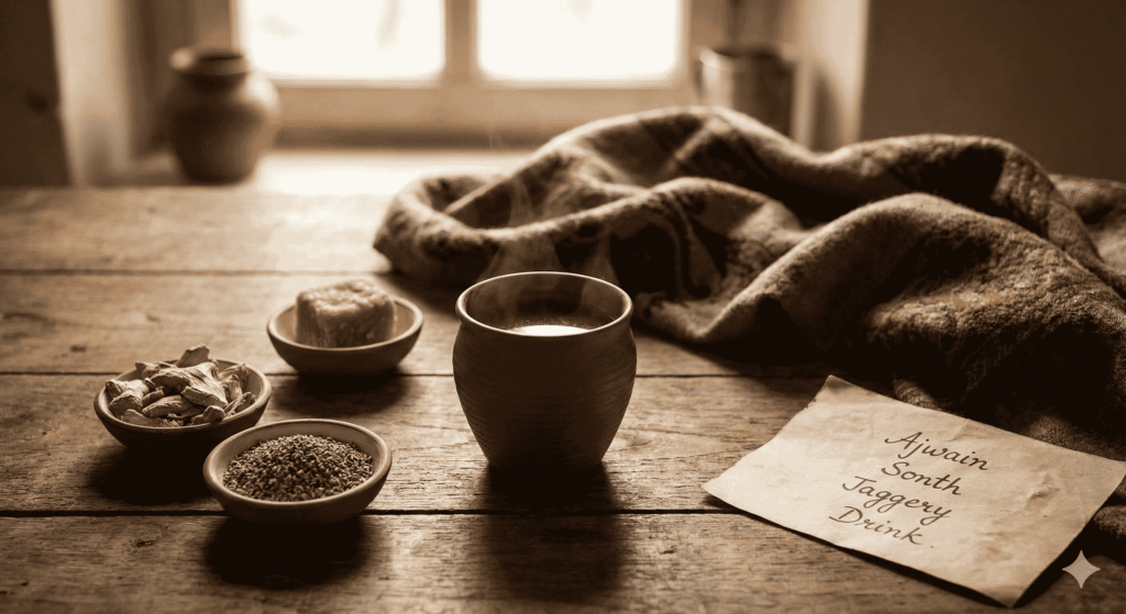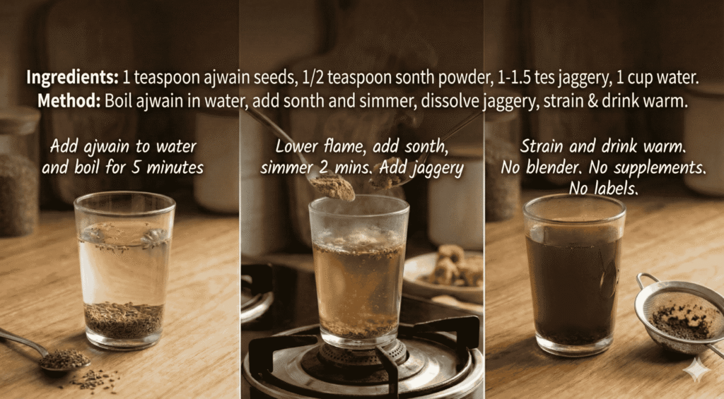 The tonic is Ajwain, Sonth, and Jaggery Drink a traditional winter remedy used across many South Asian households, especially for people over 40.